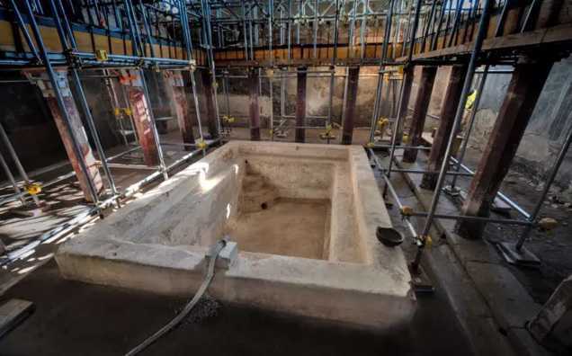 Essa terma é apenas a mais recente das surpresas reveladas por essa magnífica residência. Em escavações anteriores, foi encontrado um salão de banquetes com paredes negras e afrescos clássicos, além de um pequeno cômodo azul, dedicado a orações e rituais religiosos.