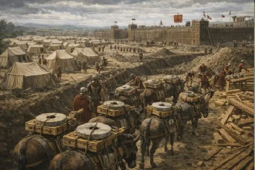 A logística romana era o verdadeiro segredo da vitória em ambientes hostis. Cada legião funcionava como uma cidade móvel. Atrás dos combatentes, seguia uma caravana de mulas carregando mós para moer grãos, tendas e ferramentas de carpintaria. Enquanto o inimigo esperava um ataque surpresa, os romanos ocupavam o tempo construindo o castra — um acampamento fortificado com fossos e paliçadas de madeira erguido em poucas horas. Essa estrutura garantia que, mesmo em território desconhecido, o legionário tivesse um local seguro para dormir, curar feridas e planejar o próximo passo.