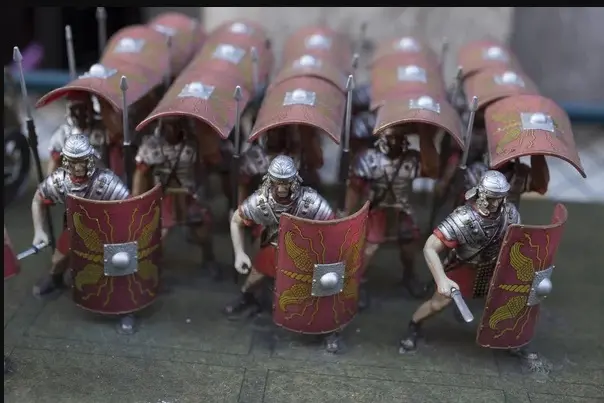 Representação de soldados legionarios com seus escudos em linha de combate