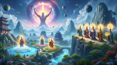 Pangu, o criador do universo, os Três Augustos e Cinco Imperadores, figuras semi-míticas da mitologia chinesa