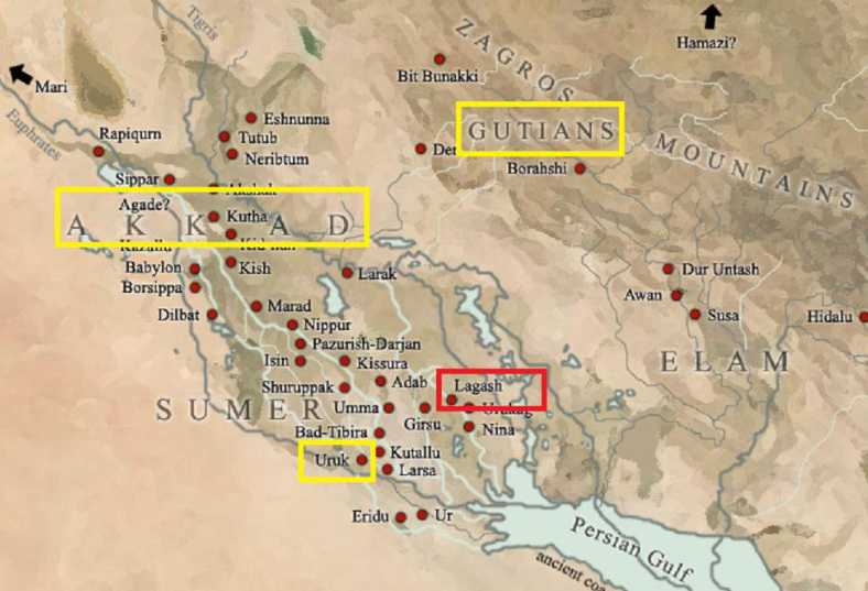 Após a queda do Império Acadiano, os gútios estabeleceram um tipo de domínio sobre a Mesopotâmia central e sul, inaugurando o que os historiadores às vezes chamam de “interlúdio gútio” ou “Idade das Trevas” mesopotâmica. Esse período, que durou aproximadamente um século (c. 2154-2050 a.C.), é caracterizado por: