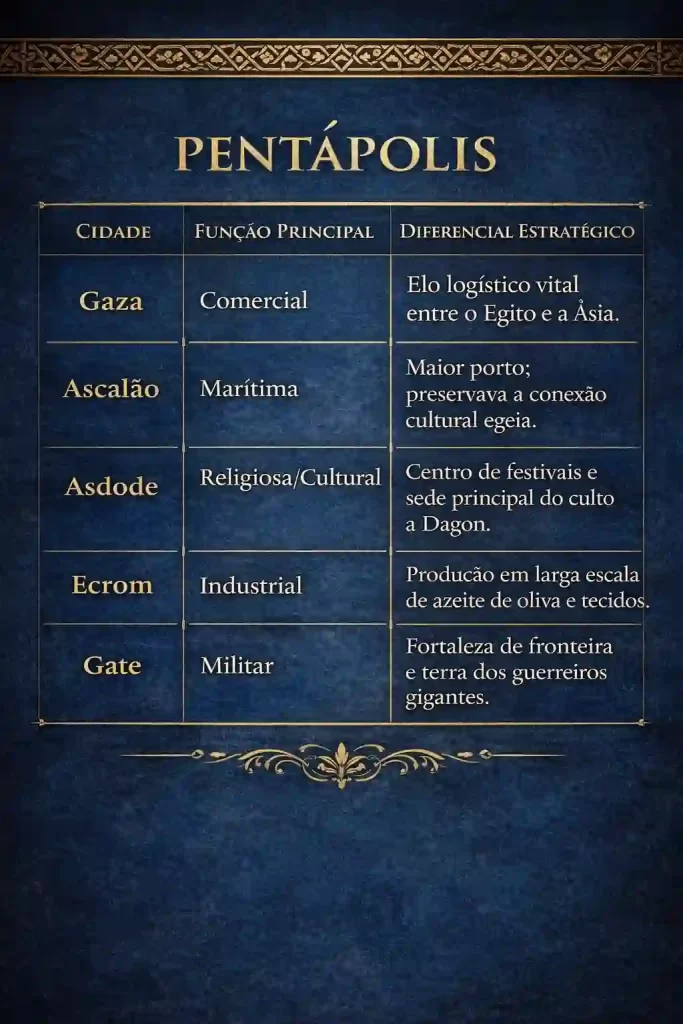 A organização dos filisteus em uma Pentápole e seu panteão sincrético revelam um povo de inteligência política aguda. Eles souberam o momento de manter suas tradições egeias e o momento de abraçar os deuses locais para consolidar seu poder. Se Israel foi o povo da “Promessa” e da “Escritura”, os filisteus foram o povo da “Estrutura” e da “Engenharia”. Sem a pressão constante dessa confederação organizada e tecnologicamente avançada, é provável que a identidade nacional de Israel nunca tivesse se consolidado da forma que conhecemos.